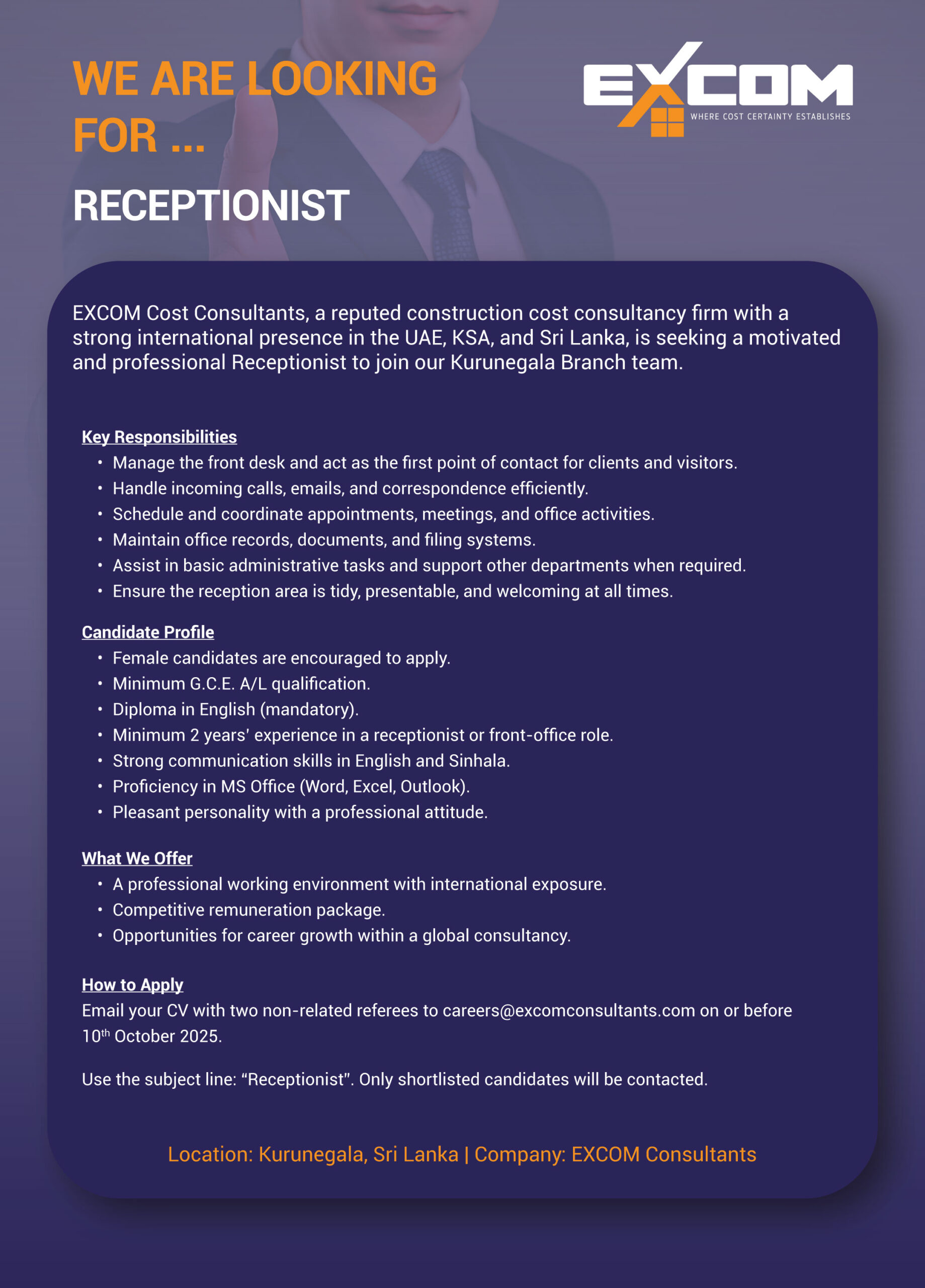 By admin October 2, 2025 0 Comment RECEPTIONIST Closing on: Oct 31, 2025 Job Category: RECEPTIONIST Job Type: Full Time Apply for this position Full Name *Email *Phone *Cover Letter *Upload CV/Resume *Allowed Type(s): .pdf, .doc, .docxBy using this form you agree with the storage and handling of your data by this website. *